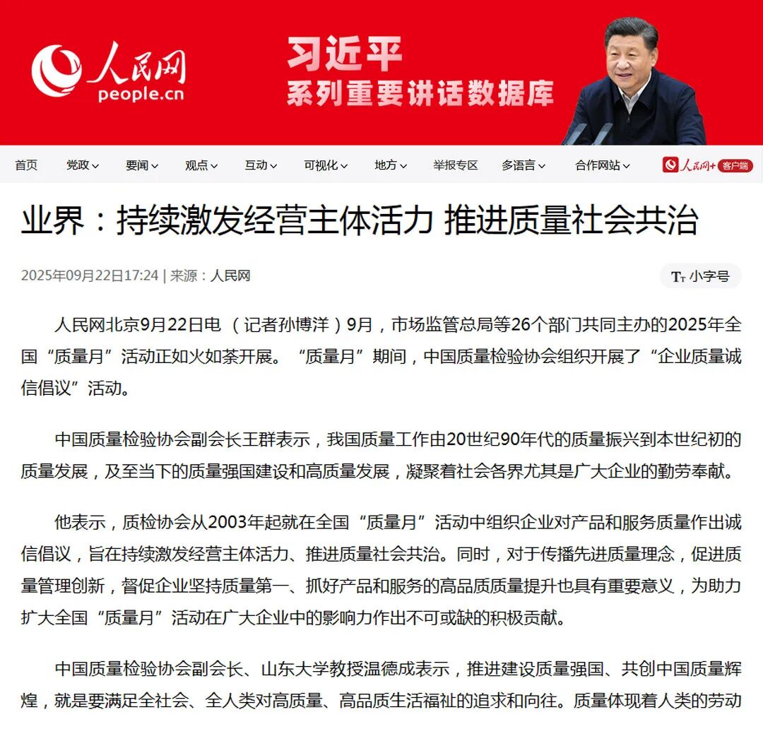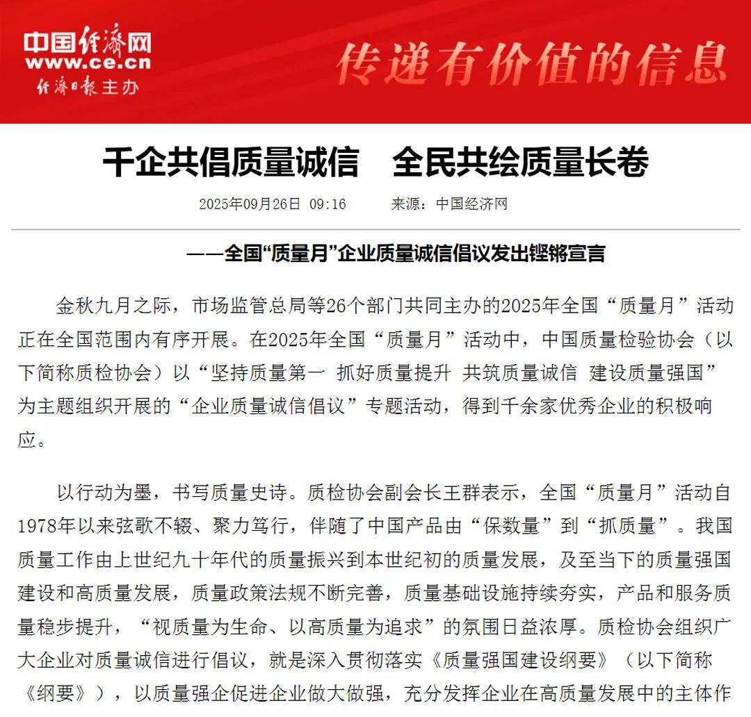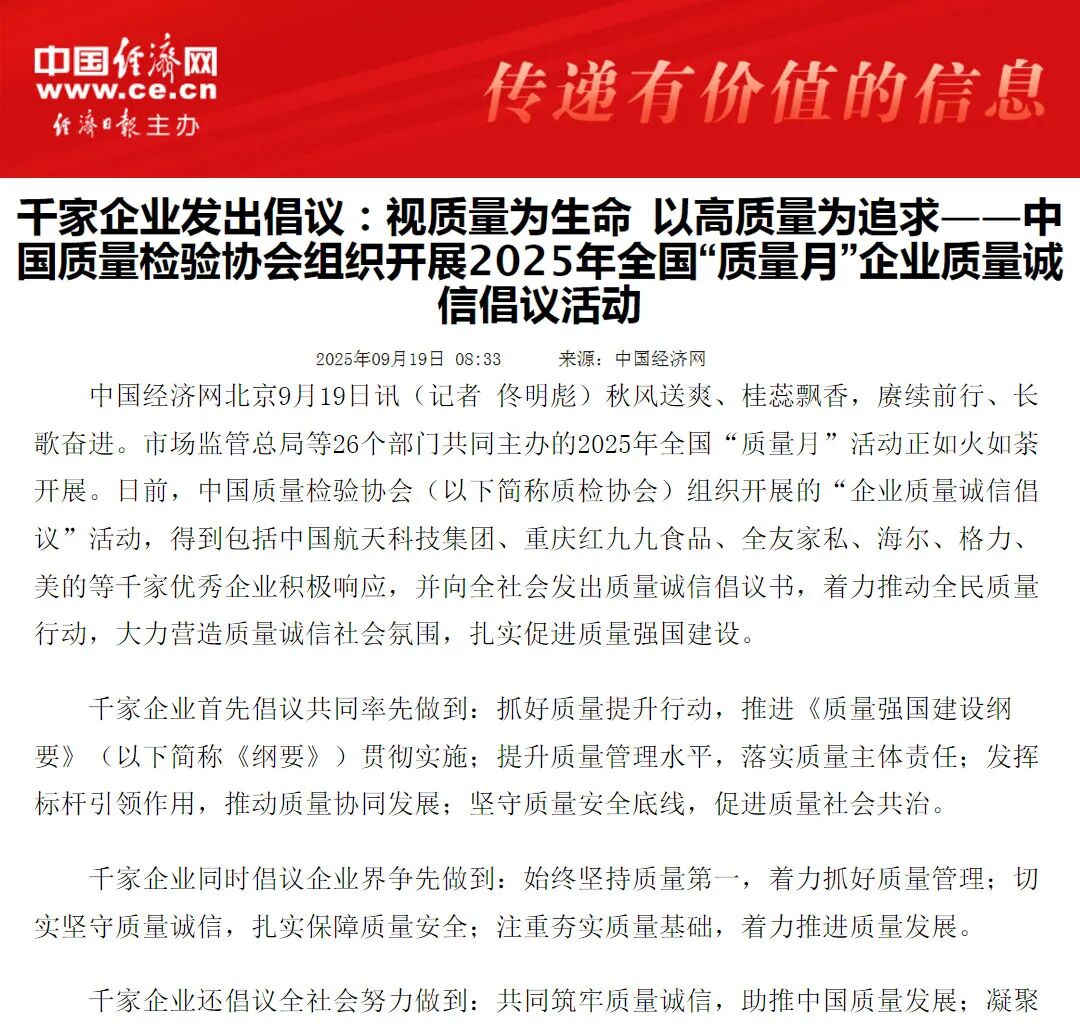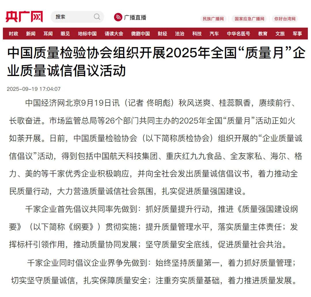 金秋九月之际,市场监管总局等26个部门共同主办的2025年全国“质量月”活动正在全国范围内有序开展。在2025年全国“质量月”活动中,中国质量检验协会(以下简称质检协会)以“坚持质量第一 抓好质量提升 共筑质量诚信 建设质量强国”为主题组织开展的“企业质量诚信倡议”专题活动,得到千余家优秀企业的积极响应。