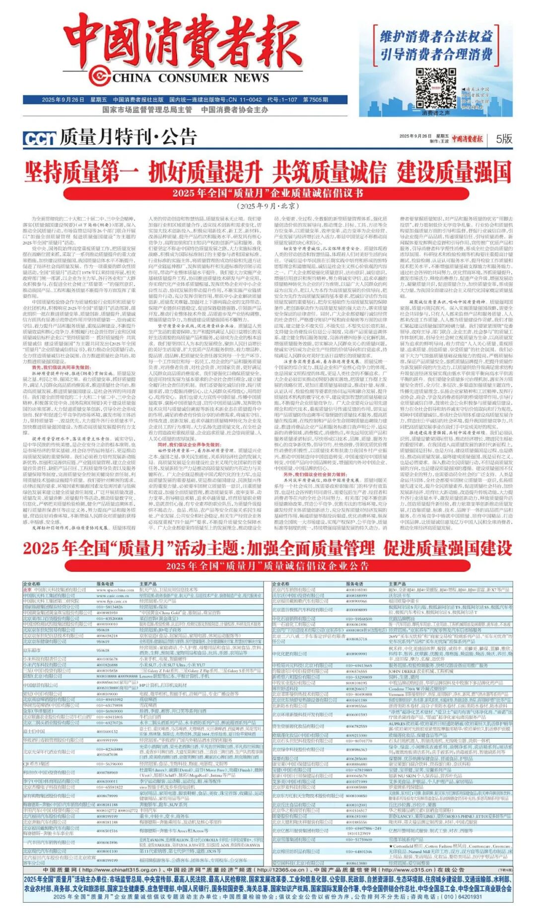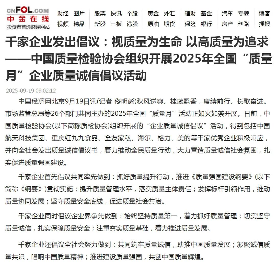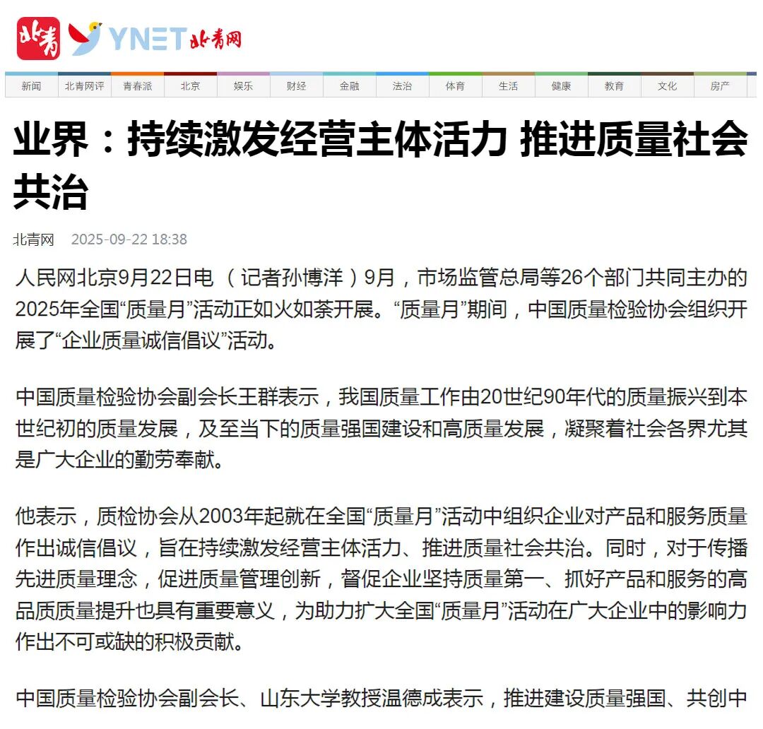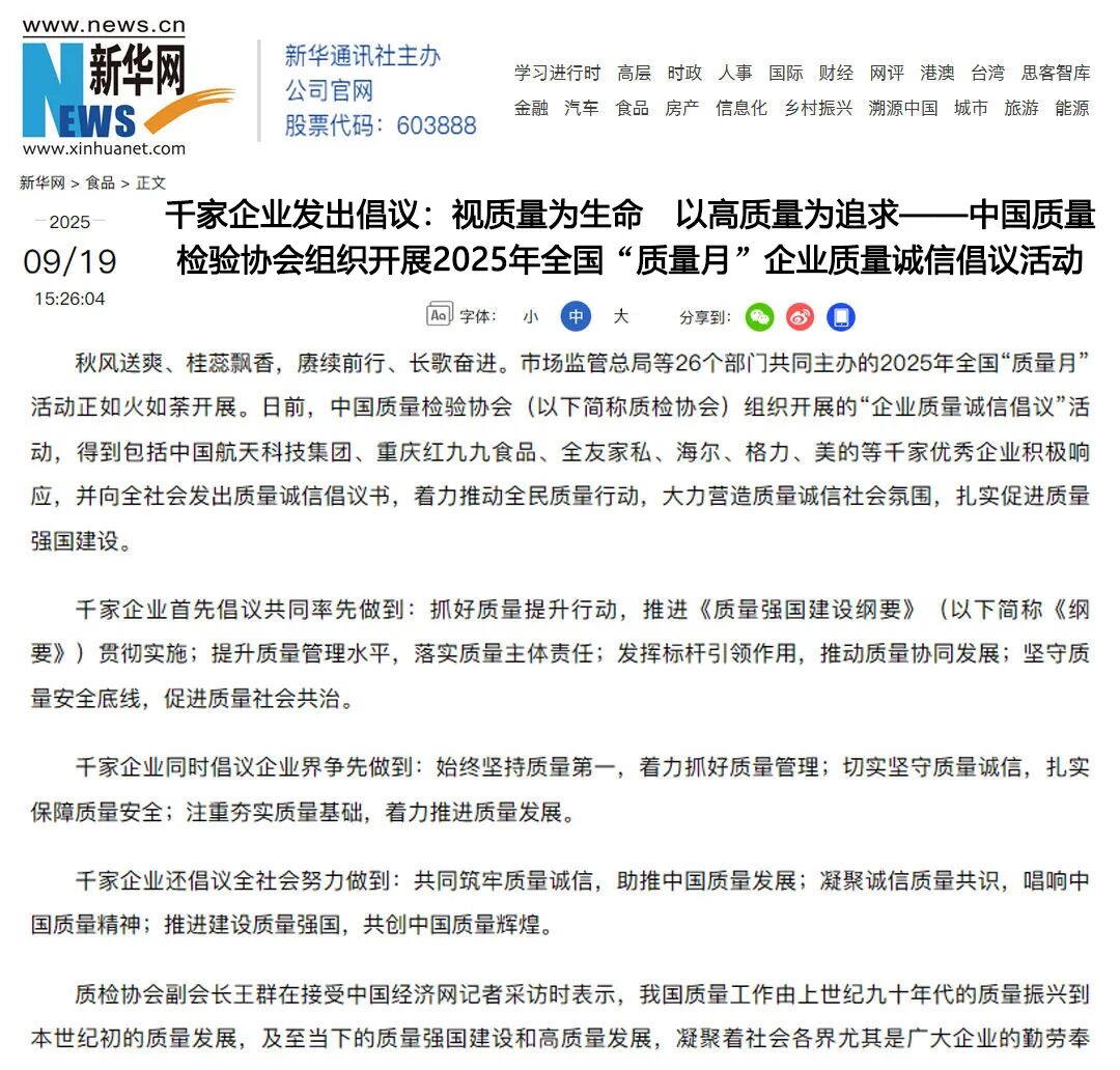 金秋九月之际,市场监管总局等26个部门共同主办的2025年全国“质量月”活动正在全国范围内有序开展。在2025年全国“质量月”活动中,中国质量检验协会(以下简称质检协会)以“坚持质量第一 抓好质量提升 共筑质量诚信 建设质量强国”为主题组织开展的“企业质量诚信倡议”专题活动,得到千余家优秀企业的积极响应。
