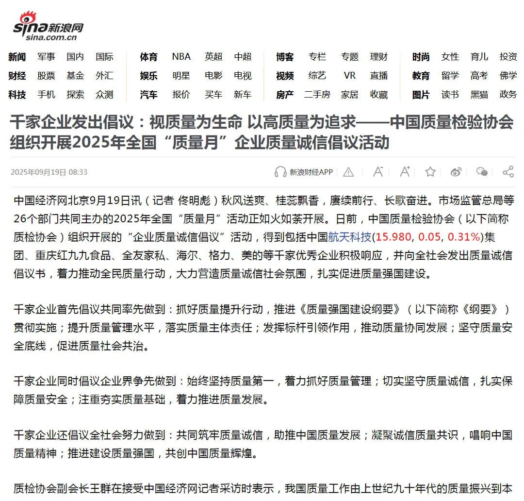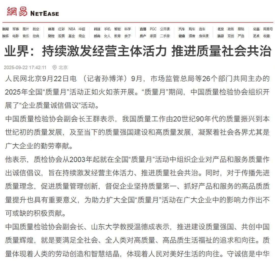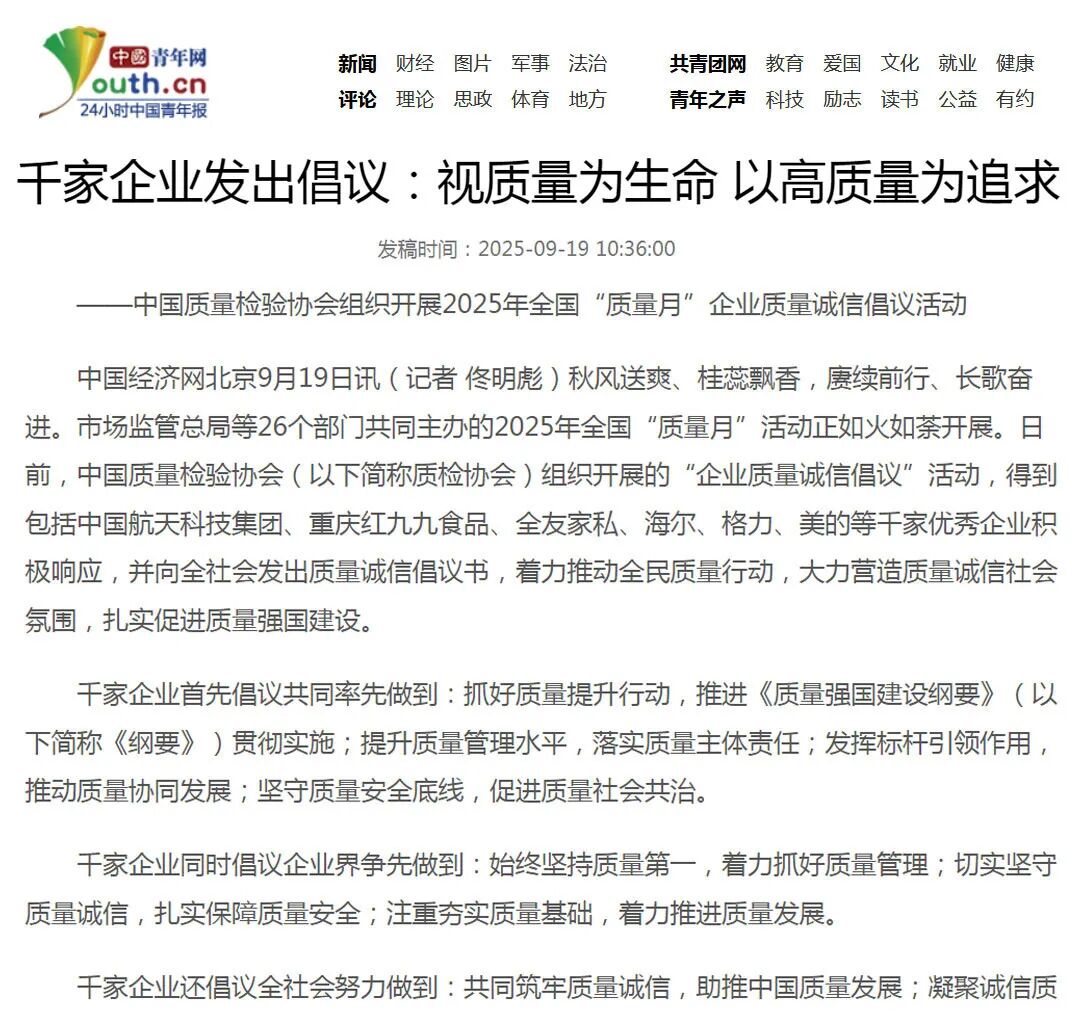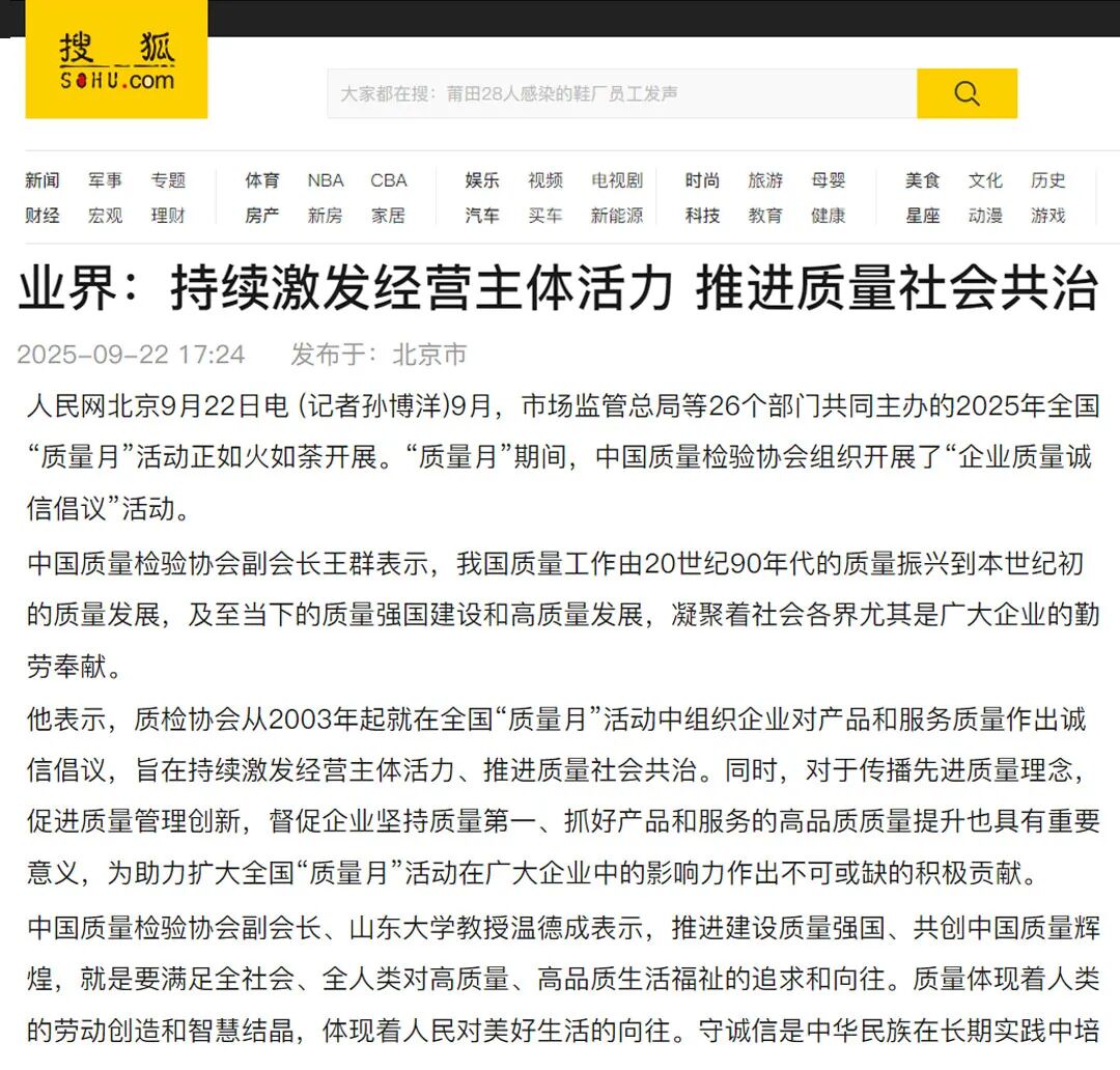 金秋九月之际,市场监管总局等26个部门共同主办的2025年全国“质量月”活动正在全国范围内有序开展。在2025年全国“质量月”活动中,中国质量检验协会(以下简称质检协会)以“坚持质量第一 抓好质量提升 共筑质量诚信 建设质量强国”为主题组织开展的“企业质量诚信倡议”专题活动,得到千余家优秀企业的积极响应。