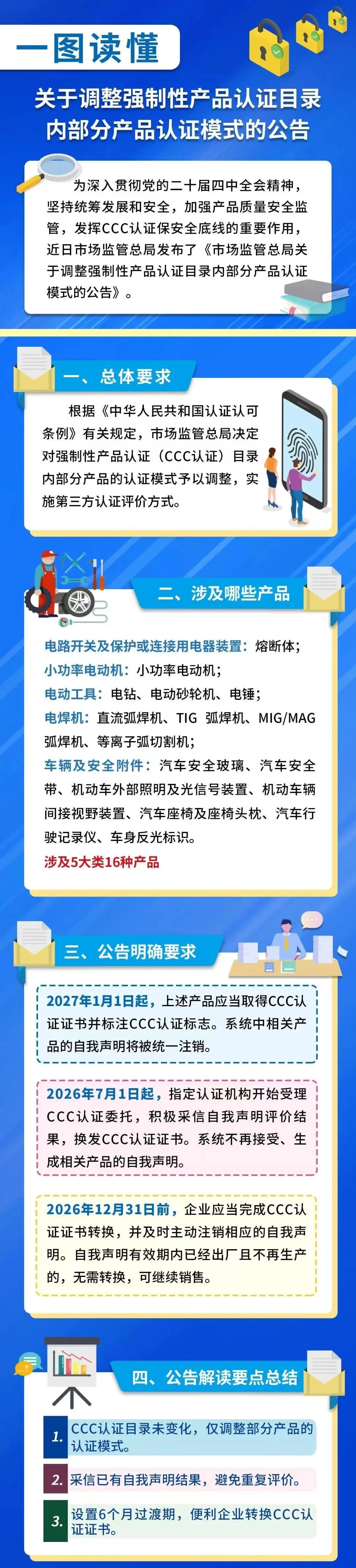 近日,市场监管总局发布《关于调整强制性产品认证目录内部分产品认证模式的公告》(以下简称《公告》),对强制性产品认证(CCC认证)目录内部分产品的认证模式作出重要调整。