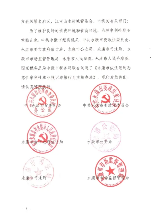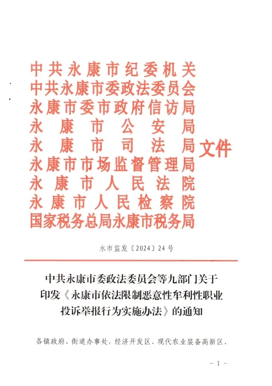 坚持以习近平法治思想为指导,在严格落实依法行政的基础上,加大对经营主体的普法宣传和合规化引导,鼓励和支持公益性举报行为,切实保护正常消费者的合法权益。对恶意性、牟利性职业投诉举报行为依法进行联合规制,着力从体制机制、行政执法、行刑衔接、司法保障、信用管理等方面规制滥用投诉举报权、信访权、纪检监察举报权和行政复议诉讼权进行牟利的行为,形成齐抓共管、长效治理的工作格局。(一)合理甄别恶意性牟利性职业投诉举报行为。本办法所称恶意性牟利性职业投诉举报行为,是指投诉举报人违背诚实信用原则,以违法手段或假借维护自身合法权益打击违法行为等理由要求惩处经营者,实质以索取高额赔偿为最终目的而提起投诉举报、复议诉讼、政府信息公开、信访、纪检监察举报等行为。(二)不断提升经营主体的合规化意识。市场监管、司法、税务等相关职能部门要加大普法宣传和合规经营指导力度,不断压实经营主体责任,督促经营者强化学法知法用法意识,做到诚信经营守法经营,妥善处理消费者的合理诉求,积极配合政府管理,自觉接受社会监督。(三)不断提高执法效能和社会治理效果。市场监管、司法、税务等相关职能部门要不断强化执法队伍的业务能力提升,改进处置方式,规范处置流程,提升处置效率。对于经营者的违法行为,要按照《中华人民共和国行政处罚法》及相关法律法规明确的“首违不罚”、“轻微不罚”精神和自由裁量意见,充分结合地方实际,将包容审慎执法理念落实到执法实践中。(四)大力推进滥诉滥议滥讼滥访治理进程。市法院牵头开展恶意性牟利性职业投诉举报人滥诉甄别,遏制其滥用复议诉讼权牟利的行为,以节约有限的行政和司法资源。(五)严厉打击利用违法手段进行索赔的行为。对以敲诈勒索、诈骗、诽谤、恐吓、辱骂、扰乱经营秩序等方式向经营者索赔的违法犯罪行为,公安、市场监管、税务等部门要建立信息共享协同机制、及时研判并依法处置。(一)成立工作领导小组。组建永康市依法限制恶意性牟利性职业投诉举报行为工作领导小组,负责全市职业索赔乱象专项治理相关工作的统筹协调工作。领导小组下设办公室,由市场监管局主要负责人任办公室主任。(二)动态管理四份名单库。一是开展恶意性牟利性职业投诉举报行为甄别,建立恶意性牟利性职业投诉举报人员名单库,并实施动态管理。二是开展滥诉行为甄别,建立“滥诉人员名单库”,并实施动态管理。三是开展投诉举报信息分析,梳理被投诉举报量异常的经营主体名单,建立“关注类经营主体名单库”,并依法分类处置。四是建立“消费维权服务站名单库”,发挥基层站点作用,及时处置消费纠纷,维护消费者合法权益。(三)注重做好四项工作。一是注重源头预防。司法、市场监管、税务等部门要加大普法教育宣传力度,不断提升经营者合规经营意识。二是注重事前研判。市场监管等相关职能部门要注重收集社会热点动态,结合投诉举报关注点变化,对可能存在或出现的问题进行提前研判,提前介入,提前消除隐患。三是注重联合甄别。建立联合甄别绿色通道,实现各职能部门信息共享,优化“恶意性牟利性职业投诉举报人员名单库”和“滥诉人员名单库”动态管理效率。四是注重部门协作。各职能部门要建立沟通协作机制,对工作中遇到的疑难性、系统性以及历史遗留性等问题,要加强沟通交流,群策群力,妥善化解。根据相关法律规定及工作实践,符合以下所列情形之一的即可判定为恶意性牟利性职业投诉举报行为:(一)购买、使用同类商品(包括服务,下同)的数量或者次数明显超出合理生活消费需要的;(二)未实际购买或使用商品,却以商品或与商品相关的广告宣传等存在涉嫌违法情形,以商家侵害其合法权益为由多次进行投诉举报的;(三)明知或应知商品存在问题,或与商品相关的广告宣传等存在涉嫌违法情形,仍然反复购买同类问题商品并进行投诉举报的;(四)反复购买相同或类似商品,并以相关商品存在涉嫌违法情形为由进行投诉举报的;(五)投诉举报、信访、行政复议或诉讼、信息公开、纪检监察举报等数量明显异常,或对行政、司法、纪检监察等部门已作出处理的事项仍重复反映的;(六)针对相同或类似问题进行大量投诉举报,或多人的投诉举报呈现内容、格式、诉求等相同或近似特点的;(七)提供虚假的投诉举报人基本信息,如不同投诉人使用同一手机号码、同一订单编号、同一地址等有明显虚假嫌疑,又不配合执法人员核验身份信息或提供证据材料的;(八)大量购买同一或不同商家商品,却在异地以相关商品存在问题进行投诉举报,且投诉举报中明显存在索赔等诉求的;(九)通过“调包”“夹带”“造假”等方式,虚构或者捏造违法事实进行投诉举报情形的;(十)以提供公共场所(如宾馆酒店等)地址,异地通过外卖平台下单,实际并未签收使用相关产品,而以相关产品存在问题进行投诉举报的;(十一)以虚假地址等恶意下单,并以商家未发货或未收到货等为由进行投诉举报的;五、对恶意性牟利性职业投诉举报、信访、行政复议诉讼和纪检监察举报等行为的处置对甄别为恶意性牟利性职业投诉举报行为的,可依法作出如下处理:1.对未受理的投诉,市场监管部门可根据《市场监督管理投诉举报处理暂行办法》第十五条第(三)项