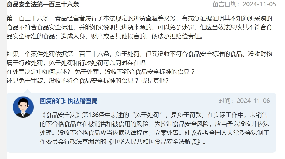 总局答复||《食品安全法》第一百三十六条“免于处罚”如何理解?
