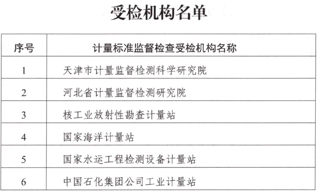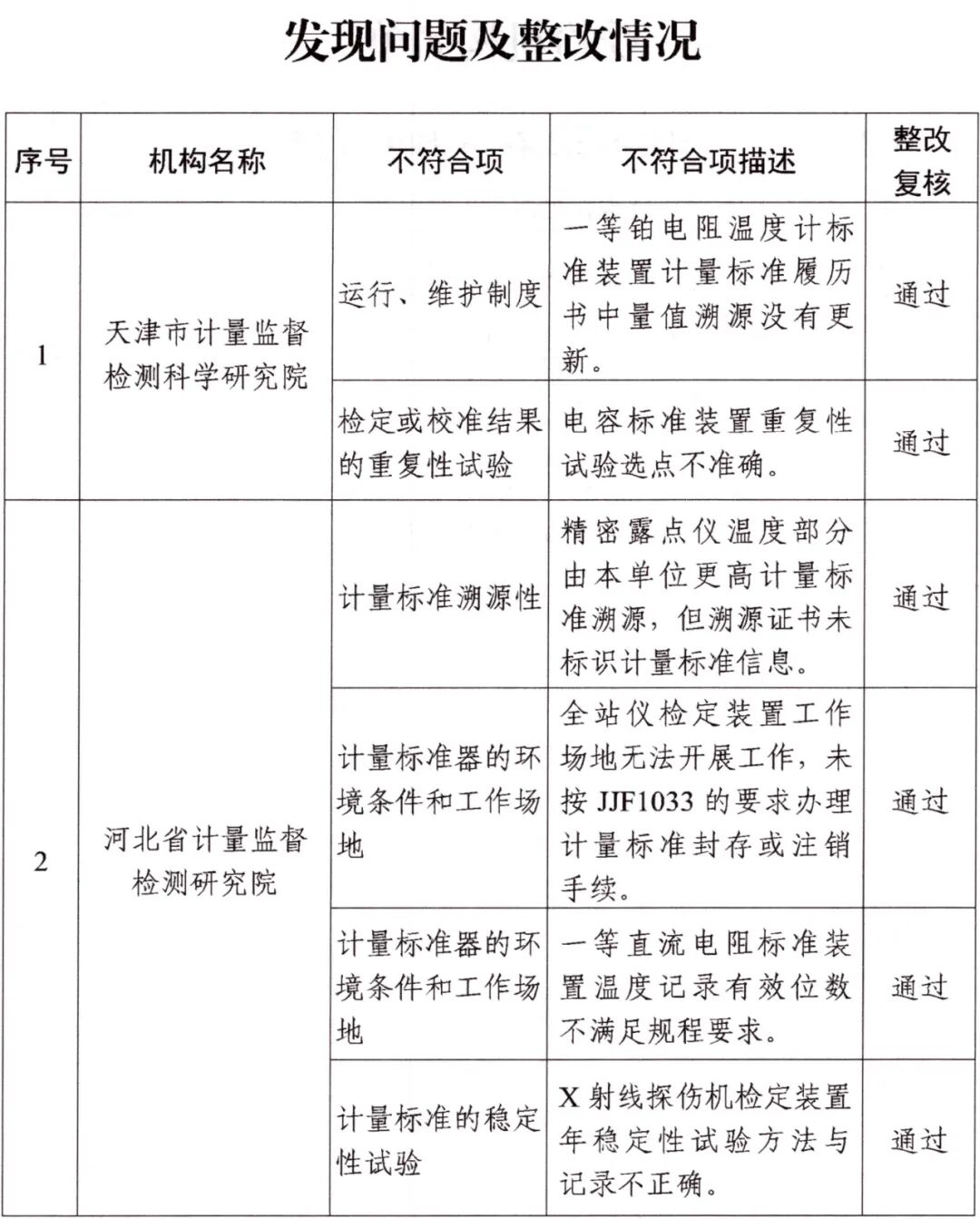 2024年,市场监管总局根据《行政许可法》《计量法》《计量法实施细则》以及《计量标准考核办法》等有关规定,在组织有关计量技术机构(以下称建标单位)自查的基础上,对位于天津市、河北省的6家建标单位实施计量标准监督检查,现场抽查58项计量标准。有关情况通告如下:主要检查建标单位对计量标准的保存、使用、维护及管理情况。重点检查计量标准考核证书有效期内的计量标准是否持续满足计量标准的考核要求,包括以下内容:是否进行重复性试验及稳定性考核,是否动态更新计量标准文件集,计量标准的溯源性是否持续符合要求,计量检定或校准人员的配备和能力是否持续符合要求,计量标准的更换、封存与注销等是否履行相关手续。现场监督检查,发现建标单位部分计量标准存在文件集信息填写不完整、《计量标准履历书》内容维护更新不及时、计量标准稳定性试验不规范、计量标准重复性考核方法不正确等问题,未发现严重违法违规行为。市场监管总局责令有关建标单位限时改正。目前,有关建标单位均已完成整改,经验证满足整改要求,复核通过。